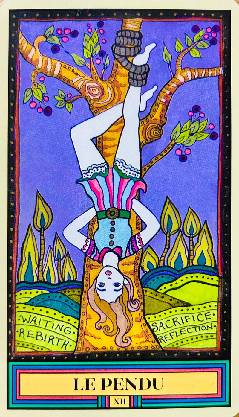 Le Pendu symbolise le lâcher-prise, la transformation intérieure et le changement de perspective.